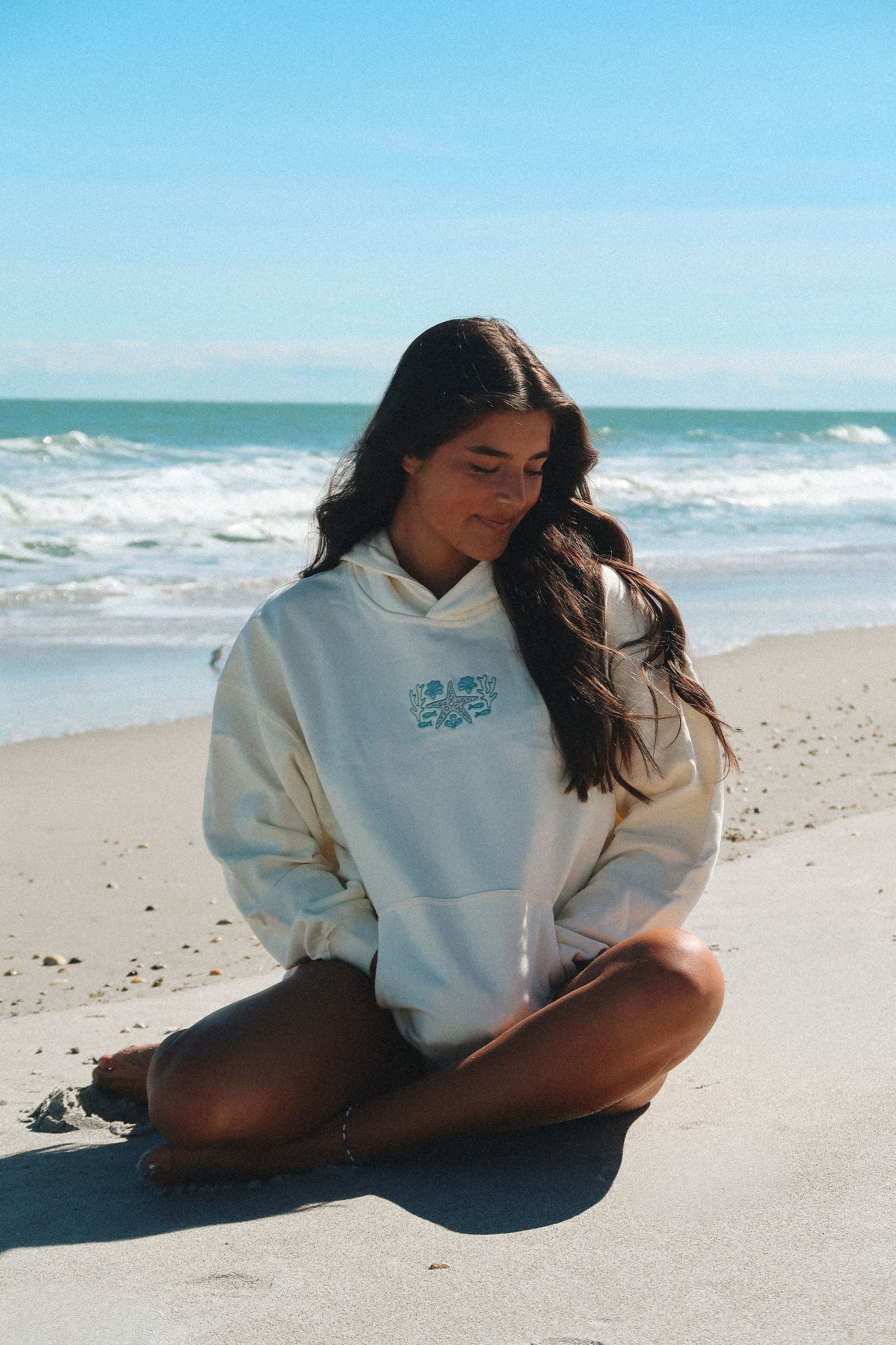 Coral Cove Hoodie is crafted from 100% cotton for unmatched breathability. Choose cream or coral, each finished with our detailed ocean-inspired embroidery and a relaxed, easygoing fit.