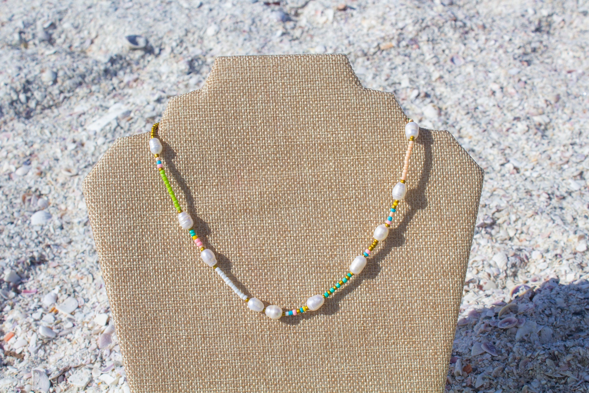 Handmade 18k gold plated necklace with pearls and multi-colored beads.